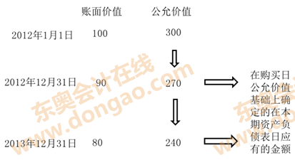 被購買方一項(xiàng)固定資產(chǎn),采用年限平均法計(jì)提折舊,無殘值,預(yù)計(jì)尚可使用年限為10年,購買日2012年1月1日