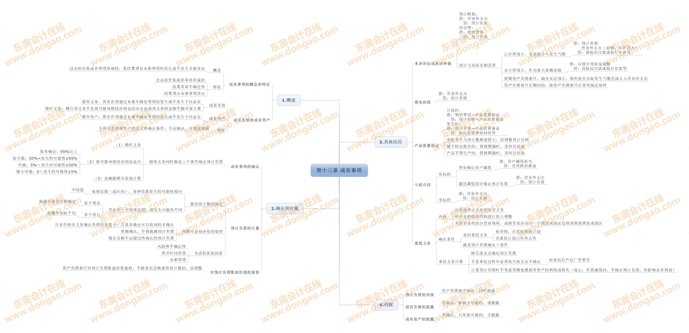 【東奧小編】2014年注冊會計師考試正式進入基礎備考階段,注會知識點繁雜細碎,想要全面掌握注會各科目的知識,需要科學高效的學習方法,思維導圖正是一種非常適合注會復習的學習方法,正確利用思維導圖,不僅能使自己積極進行知識點總結,形成清晰的思路,還能對知識點進行快速查漏補缺。以下是2014注會《會計》第十三章或有事項思維導圖: