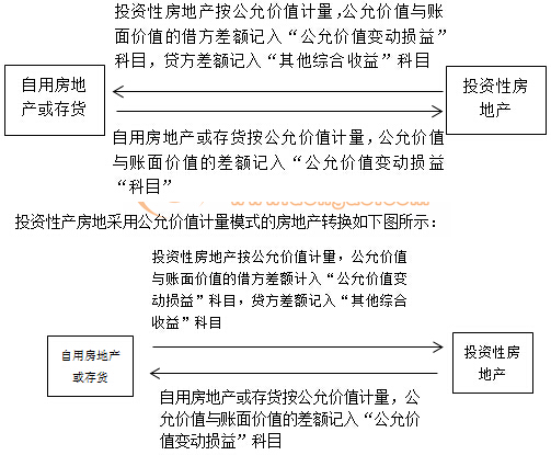 投資性產(chǎn)房地采用公允價值計量模式的房地產(chǎn)轉換如下圖所示: