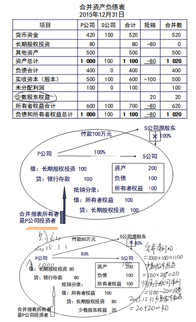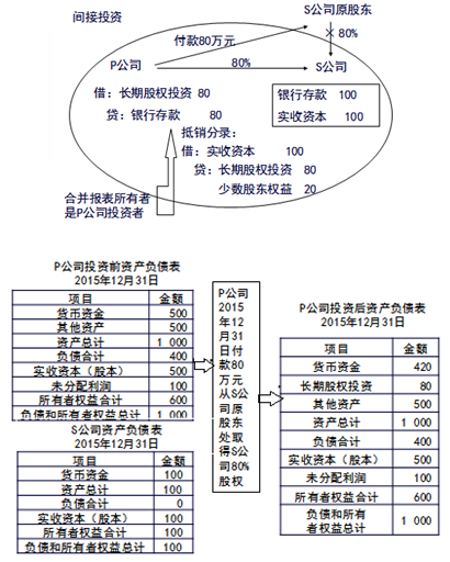 、跴公司投出80萬元貨幣資金取得S公司80%股權(quán),即P公司向S公司原股東支付80萬元貨幣資金,取得S公司原股東擁有的S公司80%股權(quán)。為簡化,假定S公司資產(chǎn)負債表中只有銀行存款100萬元,實收資本100萬元。作為企業(yè)集團整體,相當于用80萬元貨幣資金取得了S公司原有資產(chǎn)和負債的80%(即凈資產(chǎn)的80%)。在合并財務報表中,S公司的所有資產(chǎn)和負債都要全額反映,其凈資產(chǎn)的20%歸少數(shù)股東所有。因此,合并財務報表中P公司個別財務報表中的長期股權(quán)投資和S公司個別財務報表中的所有者權(quán)益不應存在,應予抵銷,并同時確認少數(shù)股東權(quán)益。圖示如下: