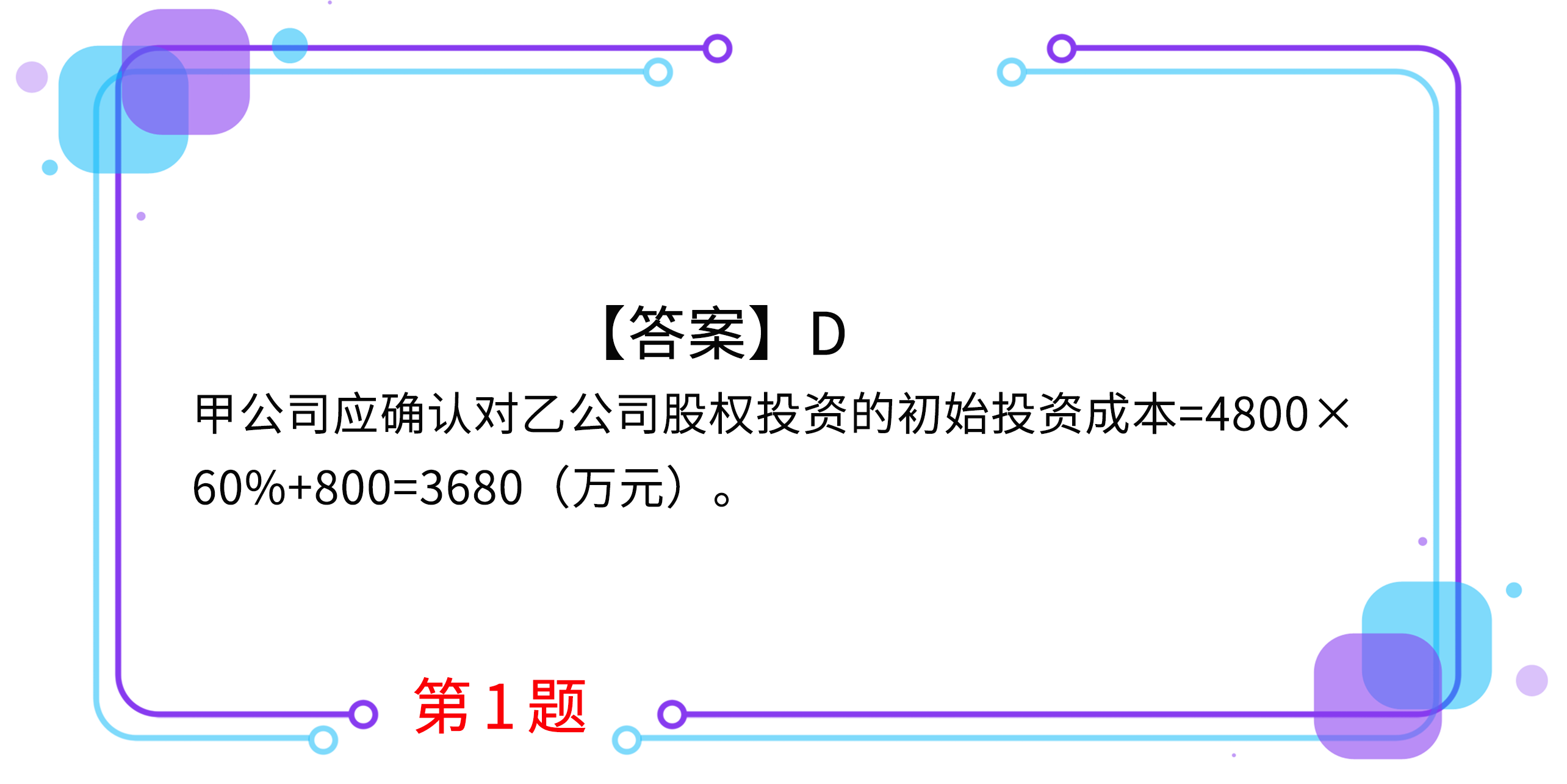 1.甲公司20×3年7月1日自母公司(丁公司)取得乙公司60%股權(quán),當(dāng)日,乙公司個(gè)別財(cái)務(wù)報(bào)表中凈資產(chǎn)賬面價(jià)值為3200萬元。該股權(quán)系丁公司于20×1年6月自公開市場(chǎng)購入,丁公司在購入乙公司60%股權(quán)時(shí)確認(rèn)了800萬元商譽(yù)。20×3年7月1日,按丁公司取得該股權(quán)時(shí)乙公司可辨認(rèn)凈資產(chǎn)公允價(jià)值為基礎(chǔ)持續(xù)計(jì)算的乙公司可辨認(rèn)凈資產(chǎn)價(jià)值為4800萬元。為進(jìn)行該項(xiàng)交易,甲公司支付有關(guān)審計(jì)等中介機(jī)構(gòu)費(fèi)用120萬元。不考慮其他因素,甲公司應(yīng)確認(rèn)對(duì)乙公司股權(quán)投資的初始投資成本是( )。