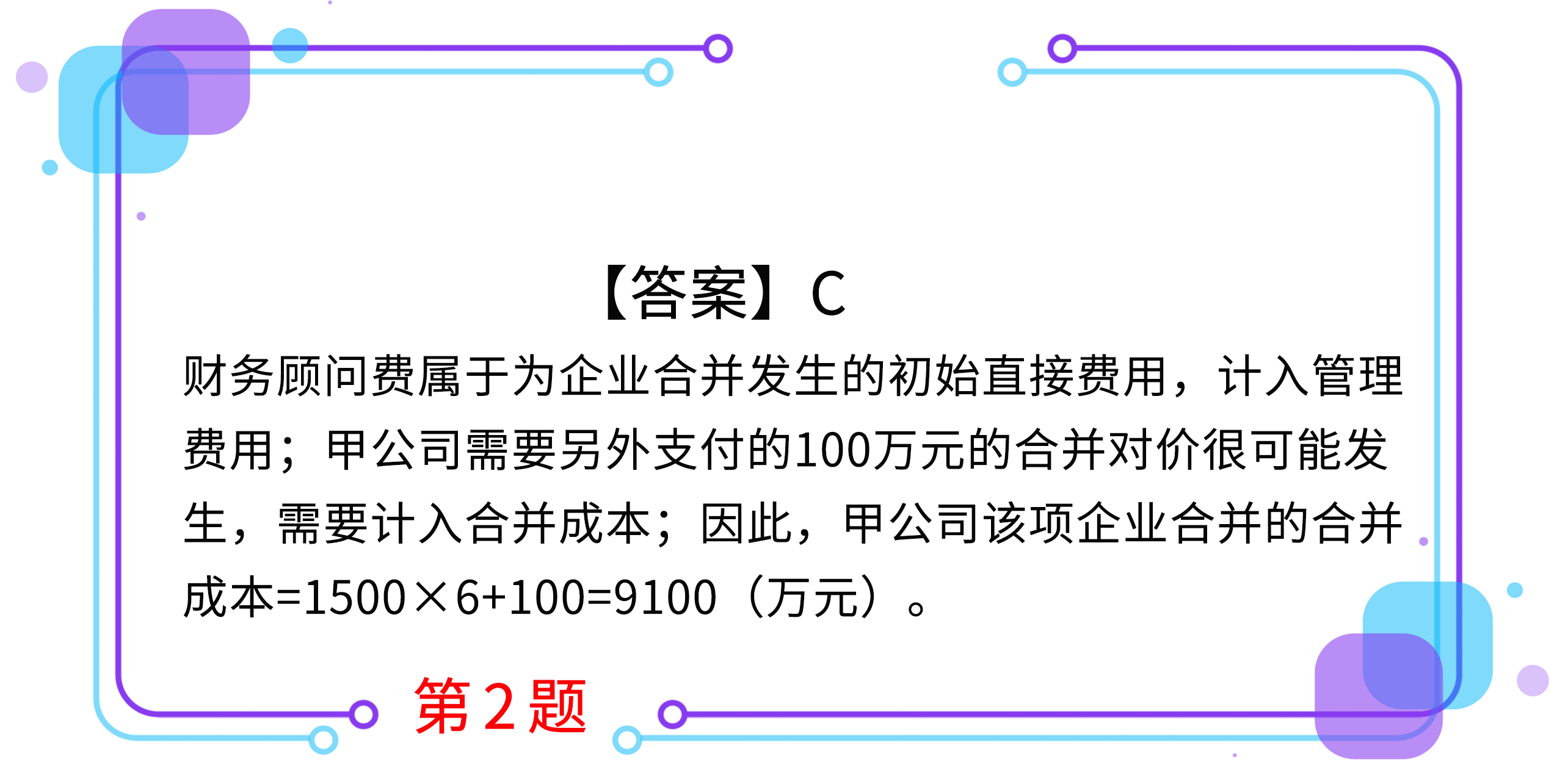 2.2×14年1月1日,甲公司通過向乙公司股東定向增發(fā)1500萬股普通股(每股面值為1元,市價(jià)為6元),取得乙公司80%股權(quán),并控制乙公司,另以銀行存款支付財(cái)務(wù)顧問費(fèi)300萬元。雙方約定,如果乙公司未來3年平均凈利潤增長(zhǎng)率超過8%,甲公司需要另外向乙公司控股股東支付100萬元的合并對(duì)價(jià);當(dāng)日,甲公司預(yù)計(jì)乙公司未來3年平均凈利潤增長(zhǎng)率很可能達(dá)到10%。該項(xiàng)交易前,甲公司與乙公司及其控股股東不存在關(guān)聯(lián)關(guān)系。不考慮其他因素,甲公司該項(xiàng)企業(yè)合并的合并成本是( )。