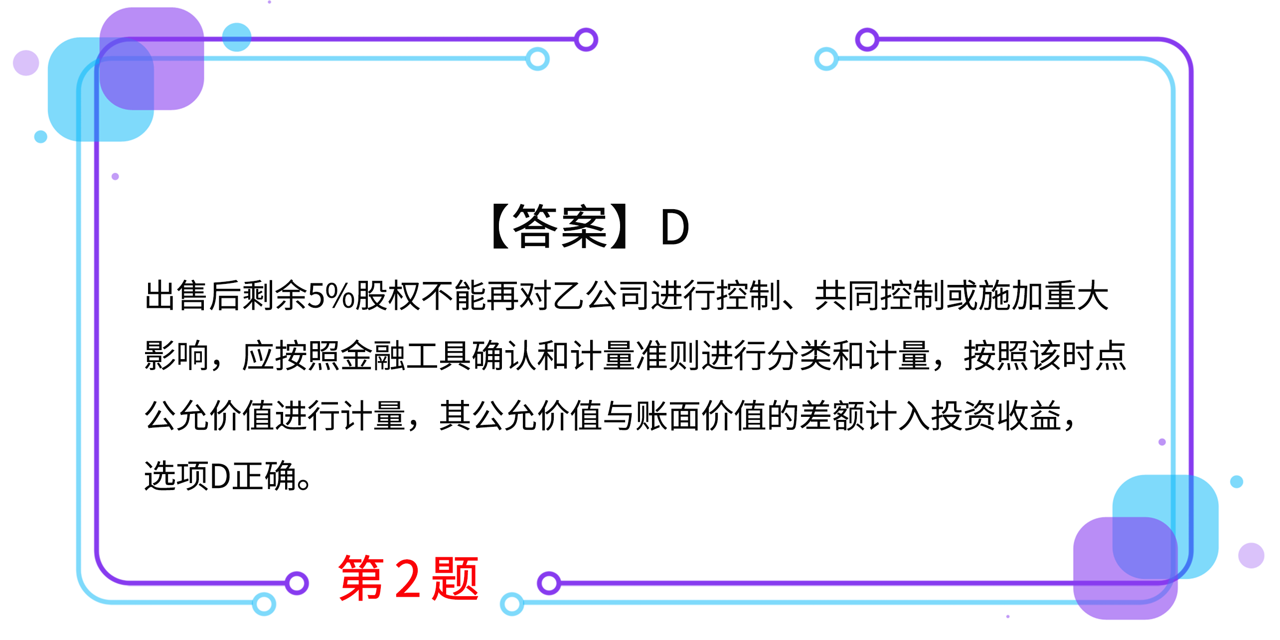 2.2×17年1月,甲公司出售所持子公司(乙公司)80%股權(quán),出售后剩余5%股權(quán)不能再對(duì)乙公司進(jìn)行控制、共同控制或施加重大影響。下列各項(xiàng)關(guān)于甲公司出售乙公司股權(quán)時(shí)對(duì)剩余5%股權(quán)進(jìn)行會(huì)計(jì)處理的表述中,正確的是( )。(2018年回憶版)