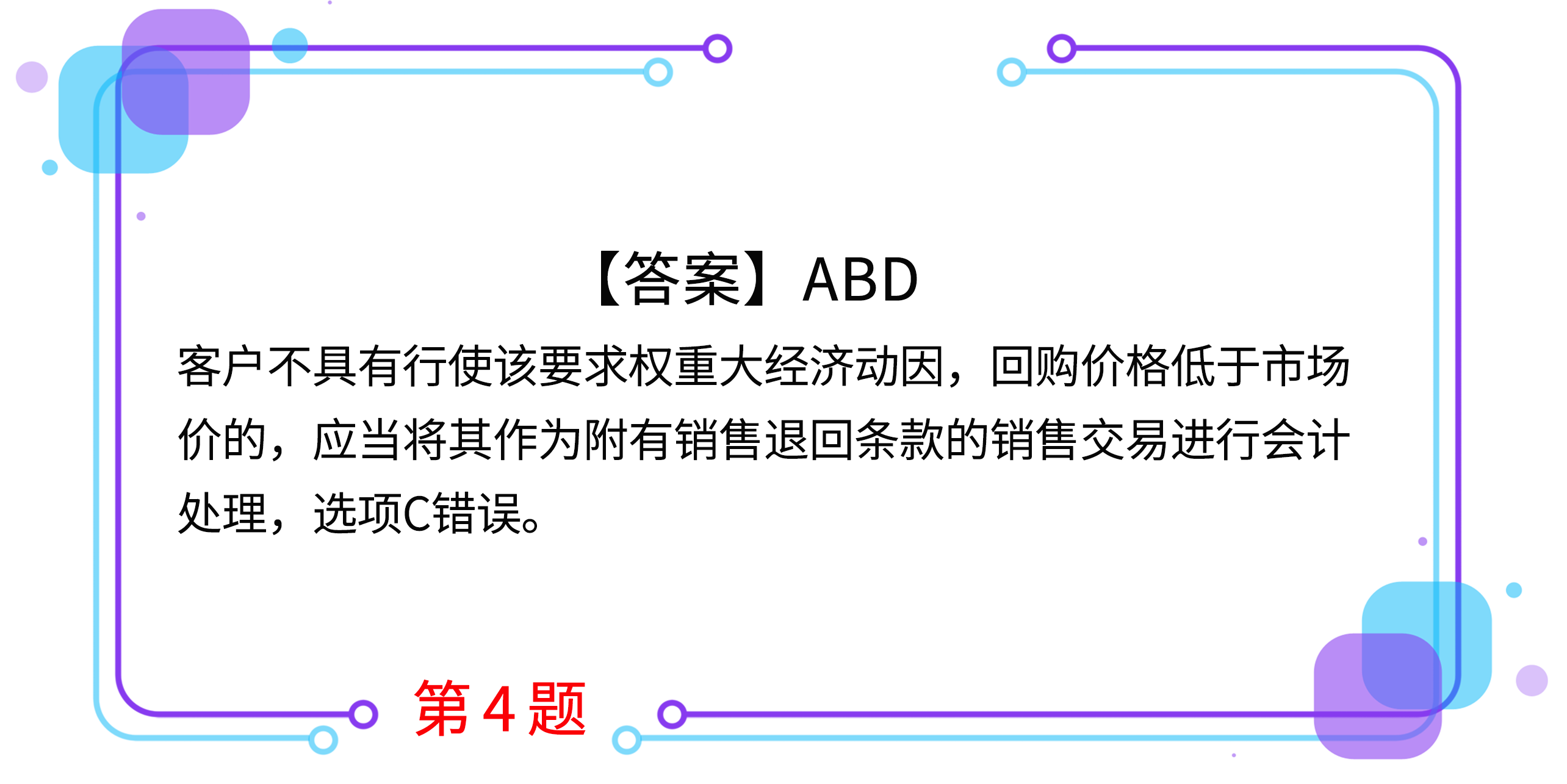 D.客戶不具有行使該要求權(quán)重大經(jīng)濟(jì)動(dòng)因,回購(gòu)價(jià)格低于市場(chǎng)價(jià)的,應(yīng)當(dāng)將其作為附有銷售退回條款的銷售交易進(jìn)行會(huì)計(jì)處理