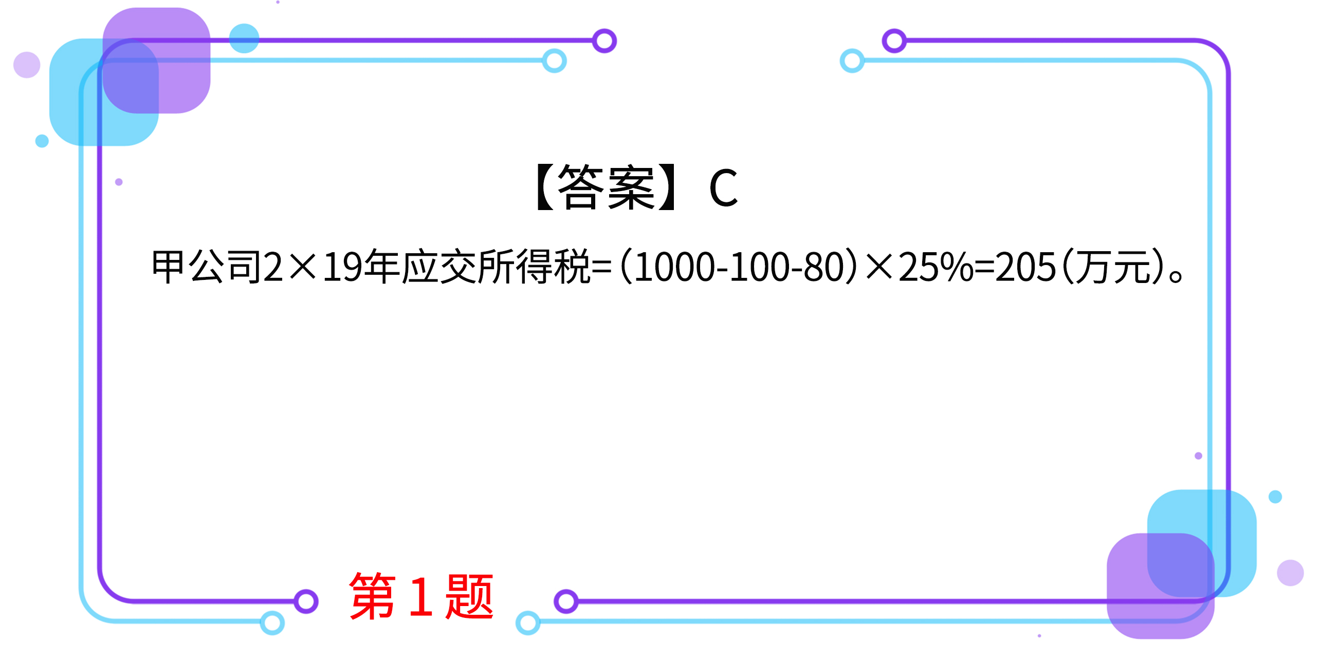 2.甲公司適用的企業(yè)所得稅稅率為25%。20×9年6月30日,甲公司以3000萬元(不含增值稅)的價格購入一套環(huán)境保護專用設(shè)備,并于當(dāng)月投入使用。按照企業(yè)所得稅法的相關(guān)規(guī)定,甲公司對上述環(huán)境保護專用設(shè)備投資額的10%可以從當(dāng)年應(yīng)納稅額中抵免,當(dāng)年不足抵免的,可以在以后5個納稅年度抵免。20×9年度,甲公司實現(xiàn)利潤總額1000萬元。假定甲公司未來5年很可能獲得足夠的應(yīng)納稅所得額用來抵扣可抵扣虧損和稅款抵減。不考慮其他因素,甲公司在20×9年度利潤表中應(yīng)當(dāng)列報的所得稅費用金額是( )。(2019年回憶版)