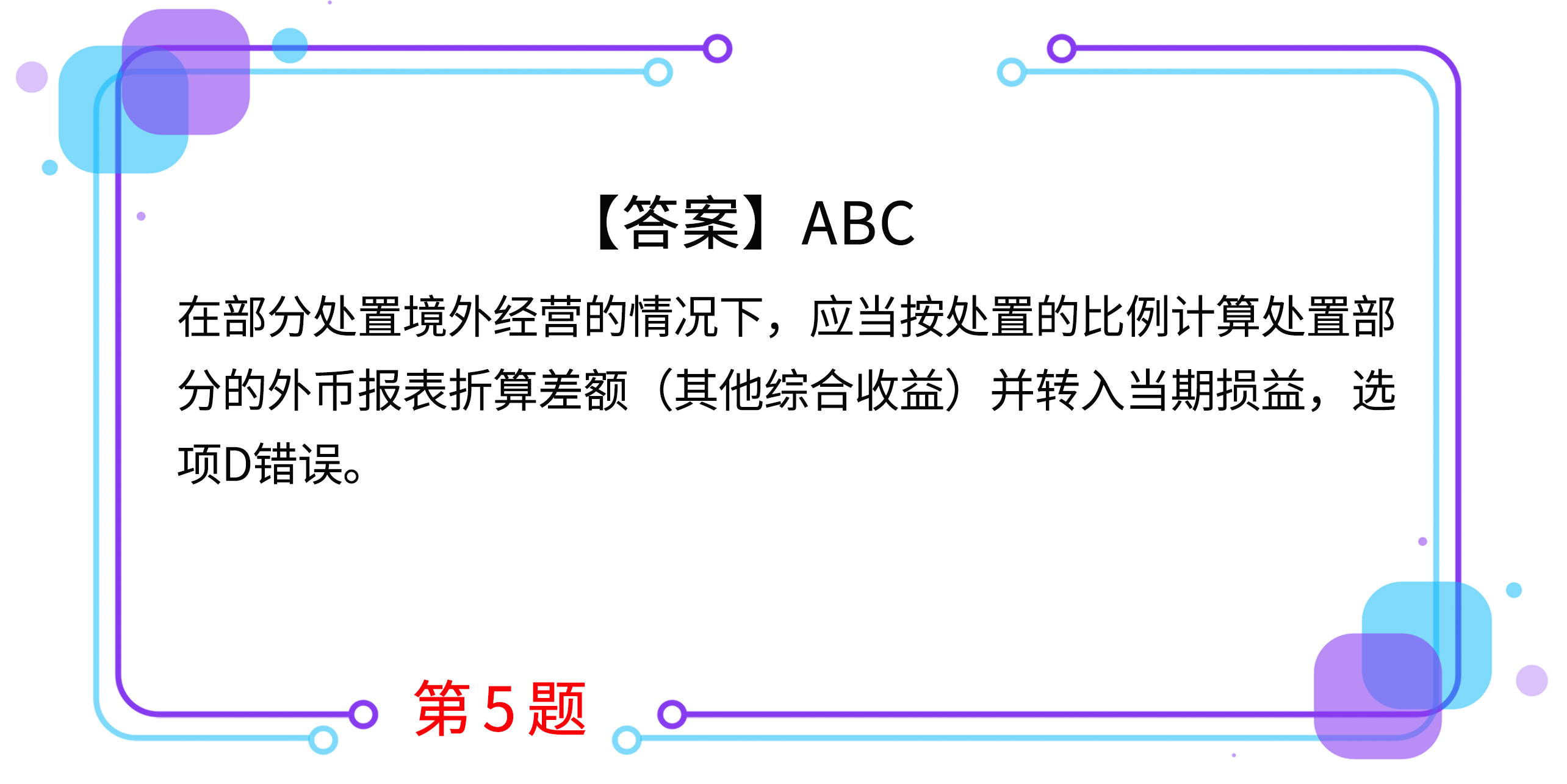 D.在部分處置境外經(jīng)營時,應(yīng)將資產(chǎn)負債表中所有者權(quán)益項目下列示的、與境外經(jīng)營相關(guān)的全部其他綜合收益轉(zhuǎn)入當期損益