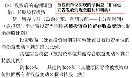 關(guān)鍵點:剩余持股比例部分應(yīng)視同取得投資時點即采用權(quán)益法核算,即對剩余持股比例投資追溯調(diào)整,將其調(diào)整到權(quán)益法核算的結(jié)果。