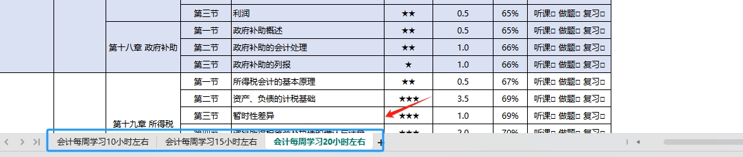 打開一份學(xué)習(xí)計(jì)劃表,在電腦屏幕的左下方位置,可以看到學(xué)習(xí)計(jì)劃表根據(jù)每周學(xué)習(xí)該科目的時(shí)長(zhǎng)劃分為三種情況,分別為“會(huì)計(jì)每周學(xué)習(xí)10小時(shí)左右”、“會(huì)計(jì)每周學(xué)習(xí)15小時(shí)左右”和“會(huì)計(jì)每周學(xué)習(xí)20小時(shí)左右”,考生請(qǐng)根據(jù)自身實(shí)際情況,選擇對(duì)應(yīng)表格。點(diǎn)擊下方圖片查看大圖!