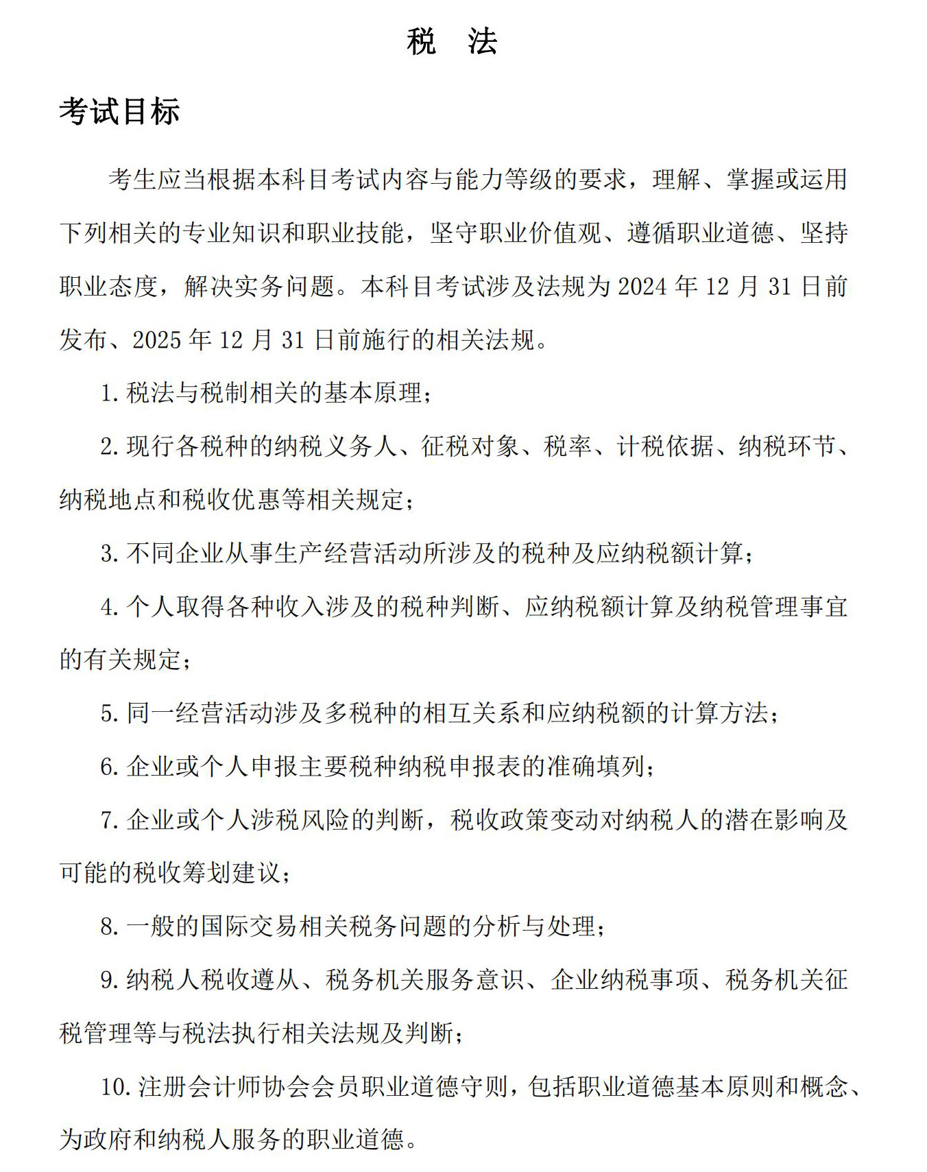 2025年注會稅法考試大綱已公布,考試大綱為考生提供了清晰的學習方向和備考策略,幫助考生更有針對性地進行備考,從而提高《稅法》科目考試的通過率?。以下是2025年注會稅法考試大綱下載入口,一起來看看吧!