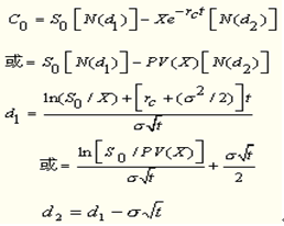 C0 = 目前價格S0×N(d1) — 行權價格的現(xiàn)值PV(X) × N(d2) |
