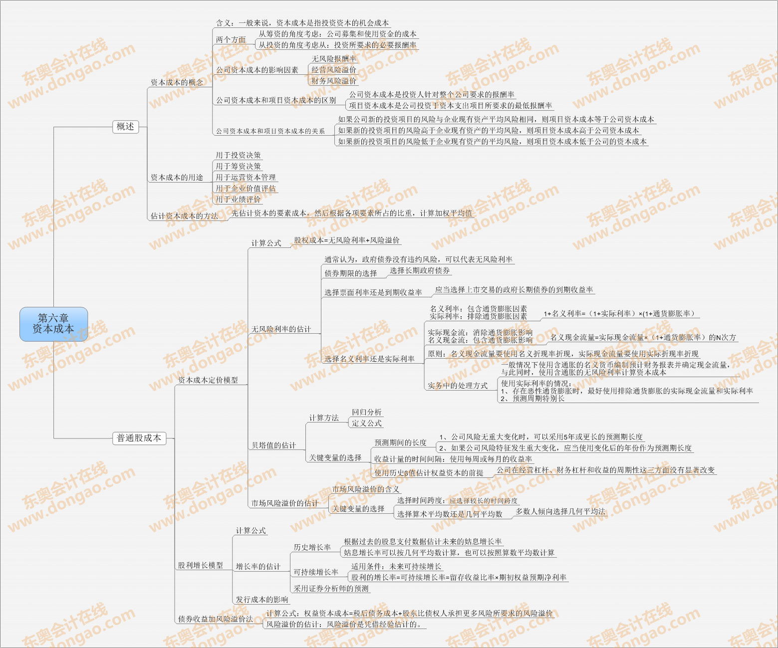 【東奧小編】2014年注冊會計師考試正式進入基礎(chǔ)備考階段,注會知識點繁雜細碎,想要全面掌握注會各科目的知識,需要科學(xué)高效的學(xué)習(xí)方法,思維導(dǎo)圖正是一種非常適合注會復(fù)習(xí)的學(xué)習(xí)方法,正確利用思維導(dǎo)圖,不僅能使自己積極進行知識點總結(jié),形成清晰的思路,還能對知識點進行快速查漏補缺。以下是2014注會《財務(wù)成本管理》第六章資本成本思維導(dǎo)圖: