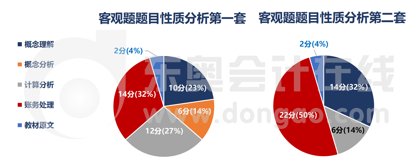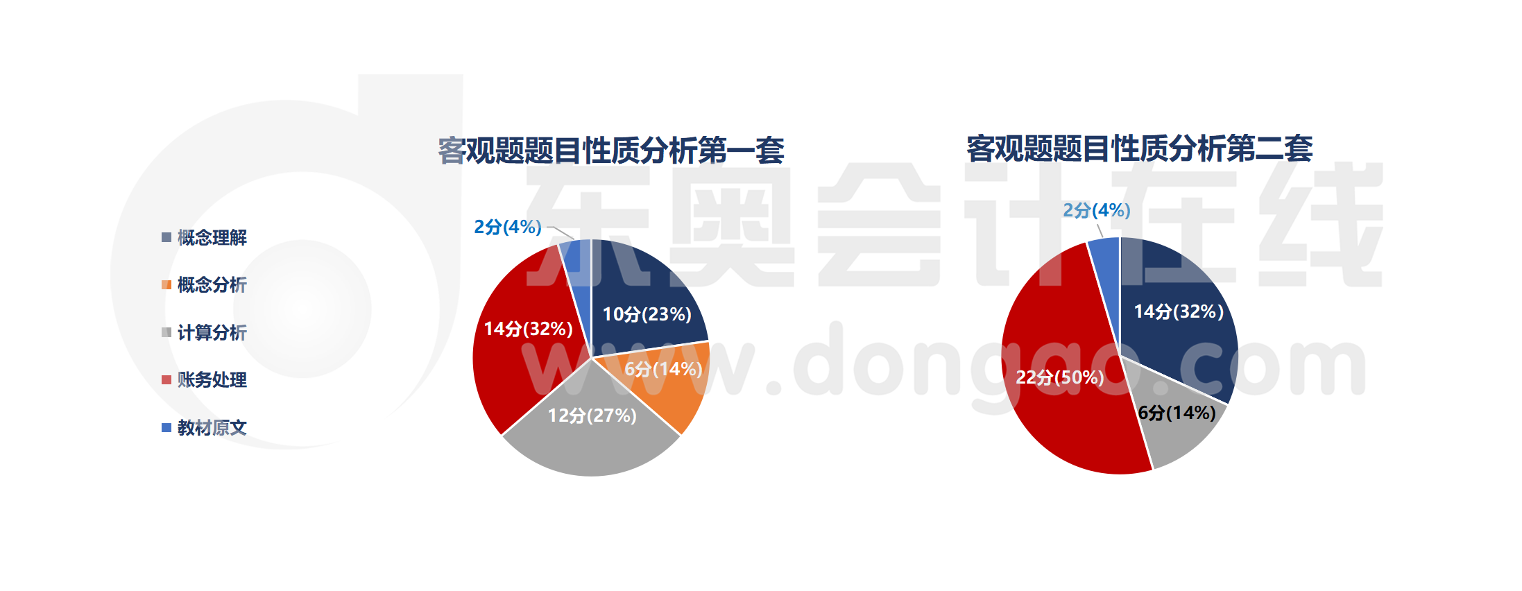 ■ 在第一套和第二套試卷中,財(cái)務(wù)處理題分值占比較大,其中試卷二中的財(cái)務(wù)處理分值占據(jù)了客觀題的50%。