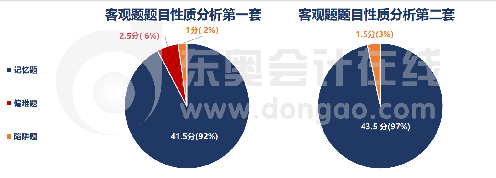 兩套試卷中,注會經(jīng)濟(jì)法客觀題主要考查三種題型,分別是記憶題、偏難題和陷阱題。兩套試卷中,記憶題所占的分值較高,第一套試題中,記憶題占客觀題的92%,分值為41.5分;第二套試題中記憶題占客觀題的97%,分值為43.5分。