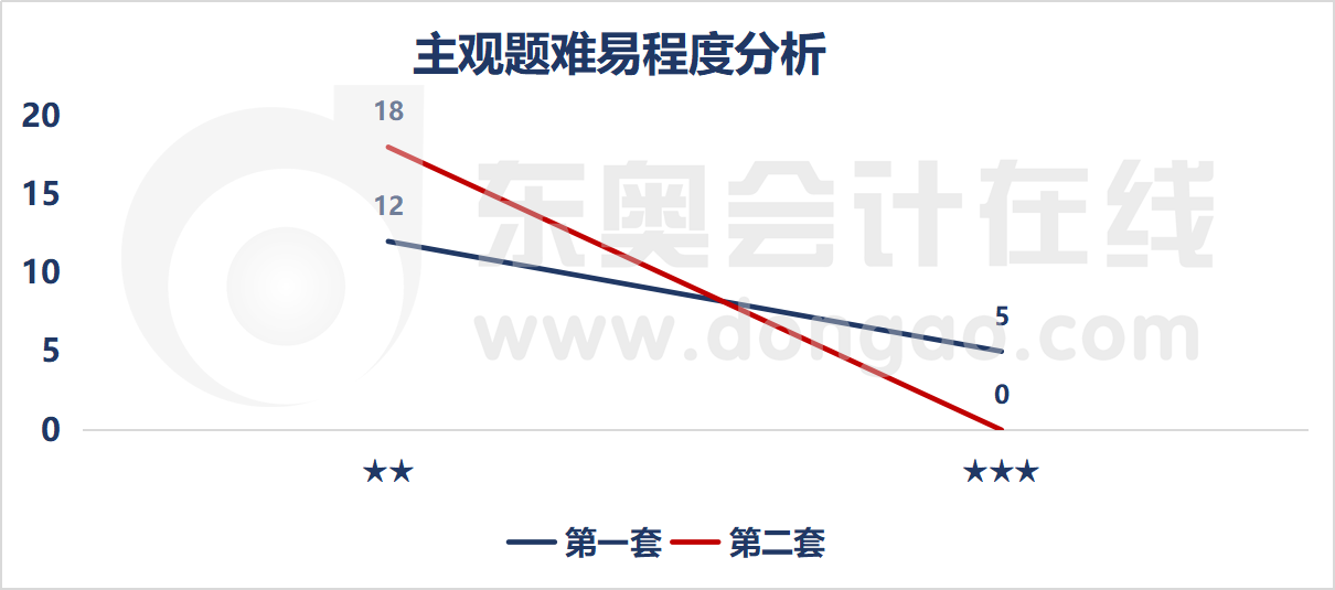 2020年注會(huì)戰(zhàn)略考試中,主觀題未出現(xiàn)一星難度考點(diǎn)。第一套試卷中,二星考點(diǎn)最多,為12道,一星考點(diǎn)為5道;第二套試卷考題主要集中在二星難度,三星考點(diǎn)沒有出題。