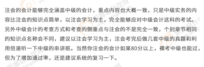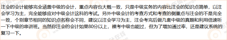 注冊(cè)會(huì)計(jì)師《會(huì)計(jì)》、《財(cái)管》和《經(jīng)濟(jì)法》基本包含了中級(jí)會(huì)計(jì)《中級(jí)會(huì)計(jì)實(shí)務(wù)》、《財(cái)務(wù)管理》和《經(jīng)濟(jì)法》考試的內(nèi)容。