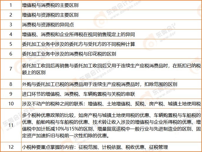 注會(huì)考試的教材內(nèi)容的排序比較適合基礎(chǔ)階段的學(xué)習(xí),在強(qiáng)化階段,建議考生把各章散亂的內(nèi)容串聯(lián)起來對比記憶,特別注意各種稅種之間有聯(lián)系的內(nèi)容,這些內(nèi)容往往是綜合題的出題點(diǎn)。強(qiáng)化階段考生們具體應(yīng)當(dāng)把握的內(nèi)容如下: