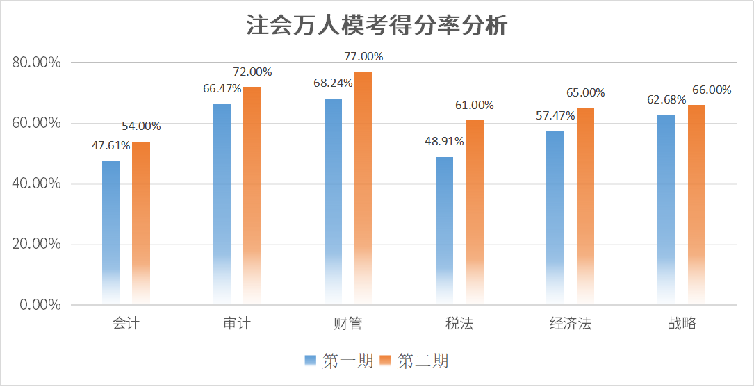 上圖為注會萬人??嫉谝黄诤偷诙诘梅致蕯?shù)據(jù),從上面的數(shù)據(jù)可以看出,萬人模考第二期各科得分率較第一期有較大提升,但會計在兩期??贾?,得分率均為最低,錯誤率高居6科榜首!