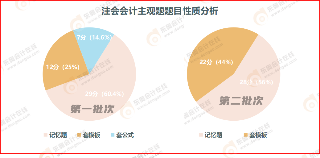 注會(huì)會(huì)計(jì)主觀題考查類型主要有記憶題、套模板題、套公式題。由此可見,注會(huì)考試題型靈活,角度多樣。兩個(gè)批次的考試中均出現(xiàn)了記憶題及套模板題,第一批次考試中還出現(xiàn)了套公式題。