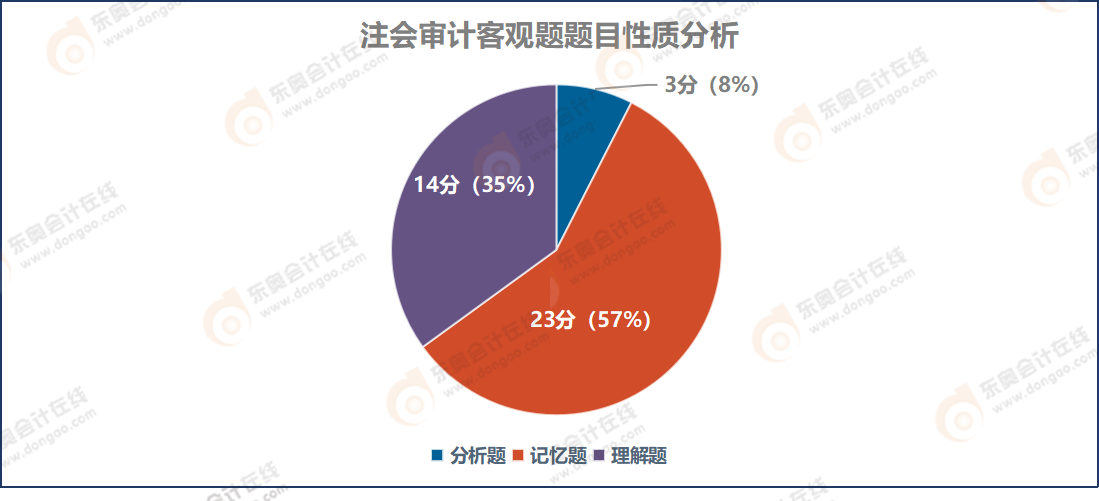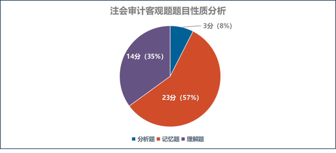 審計(jì)客觀題考查的題型包括分析題、記憶題和理解題所有題型中,記憶題占比最高,占客觀題總分的57%,理解題占35%,分析題占8%。