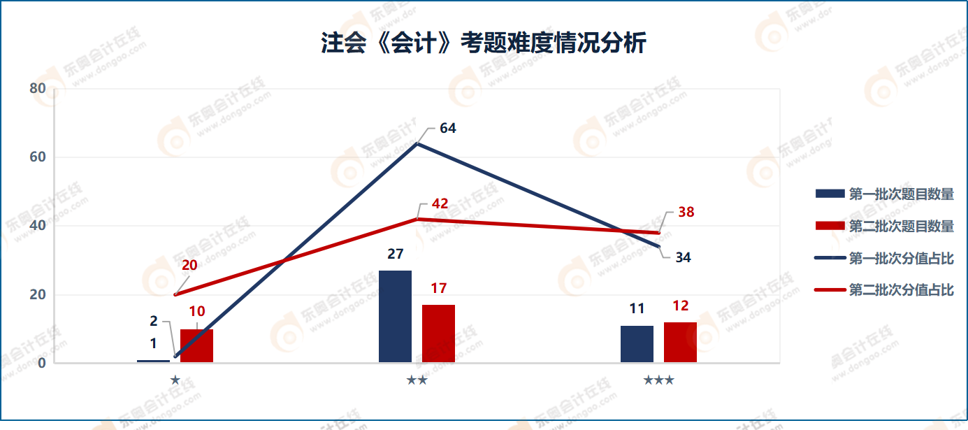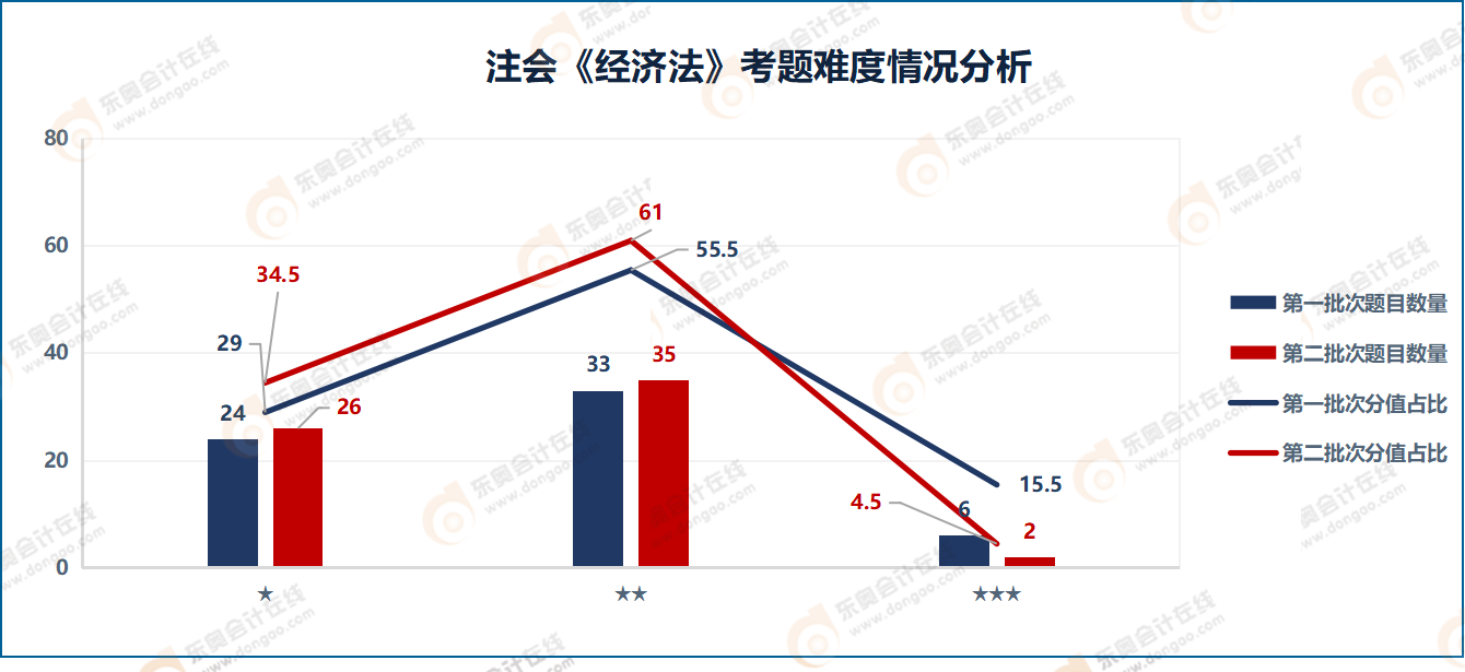 注會經(jīng)濟(jì)法科目考點(diǎn)主要集中在1星和2星難度,第一批次考試中,2星考點(diǎn)分值最多,為55.5分,3星考點(diǎn)分值最少,為15.5分;第二批次考試中,2星考點(diǎn)分值最多,為61分,3星考點(diǎn)分值最少,為4.5分。