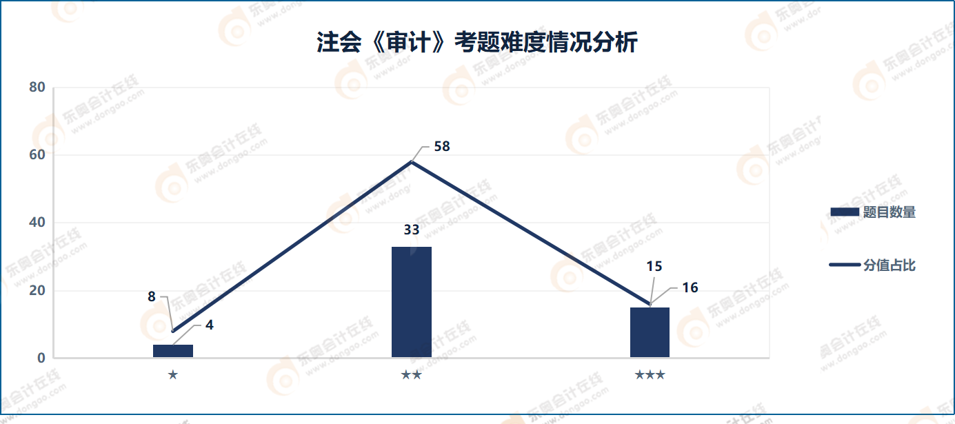 根據(jù)考生回憶整理的審計題目中,2星難度考題數(shù)量最多,共計33道,分值為63分,3星難度考題數(shù)量適中,數(shù)量為15道,共計16分,1星難度考題最少,僅有4道,分值為8分。
