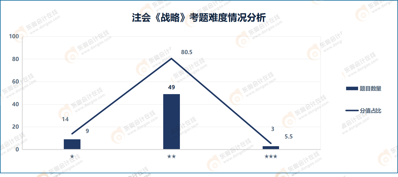 戰(zhàn)略考試考點(diǎn)中,2星難度考題最多,分值也最大。2星考點(diǎn)出題49道,分值為80.5分;1星考點(diǎn)出題9道,分值14分;3星考點(diǎn)出題3道,總計5.5分。