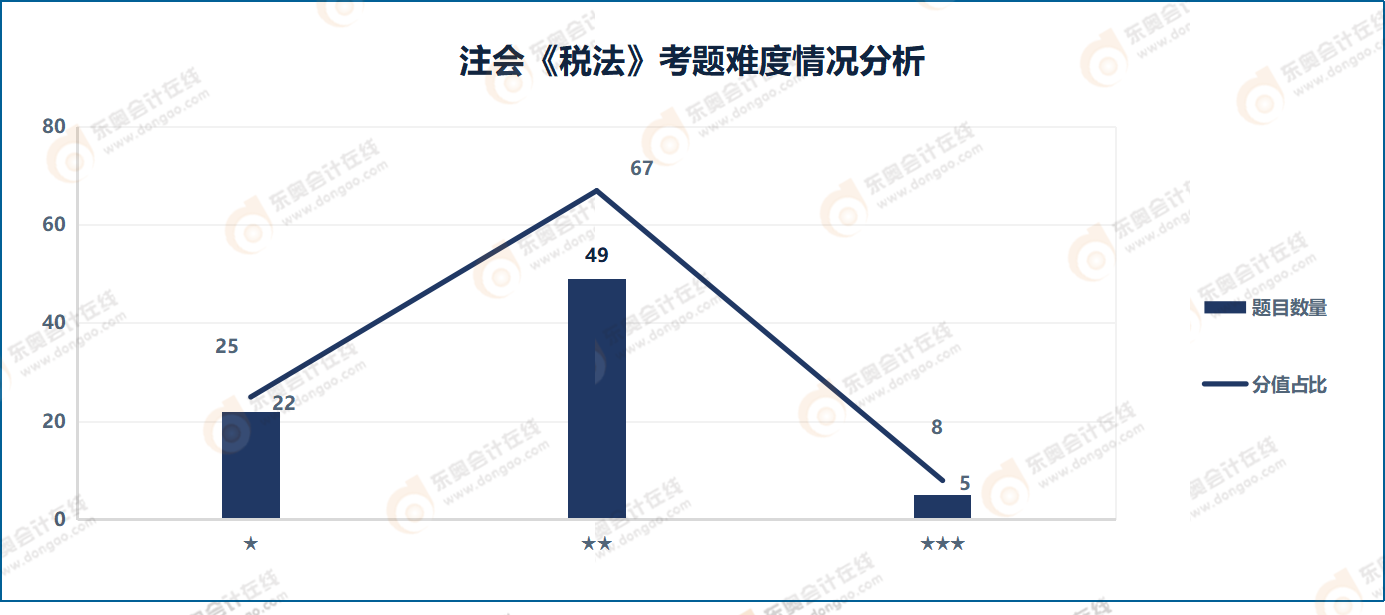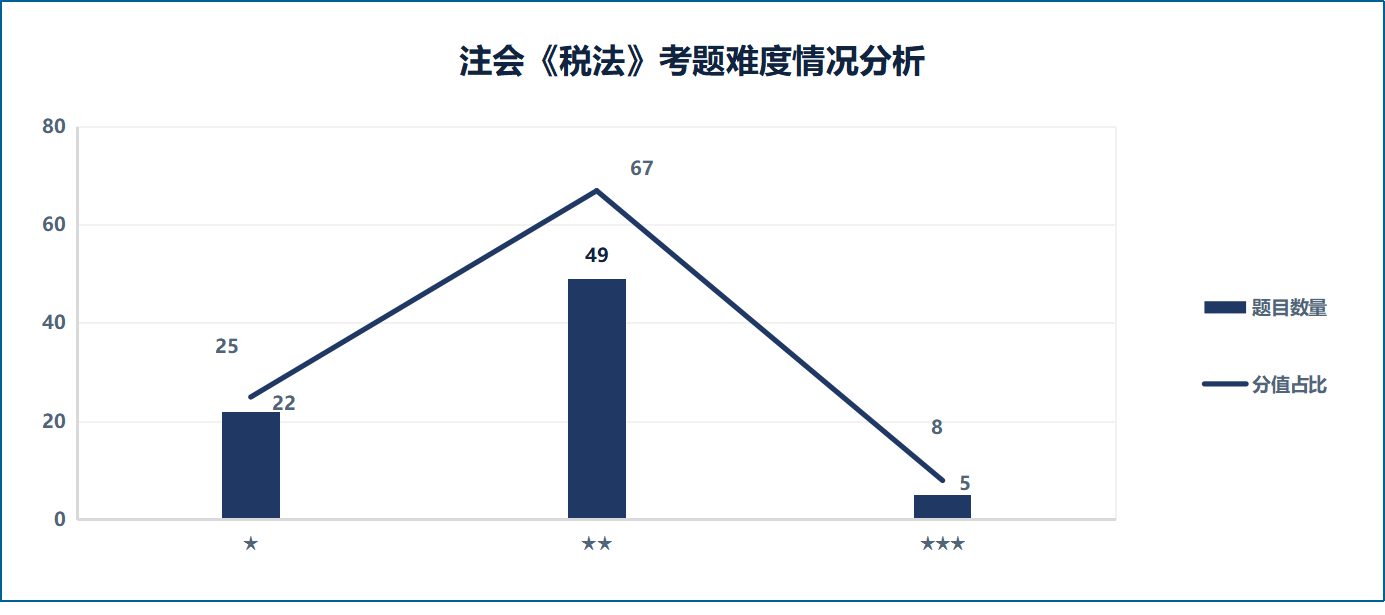 稅法考試中,2星難度考點(diǎn)題量最多,分值也最高;1星難度考點(diǎn)次之,3星難度考點(diǎn)最少。1星難度考點(diǎn)共計22道題,分值為25分;2星難度考點(diǎn)共計49道題,分值為67分;3星難度考點(diǎn)共計5道題,分值為8分。