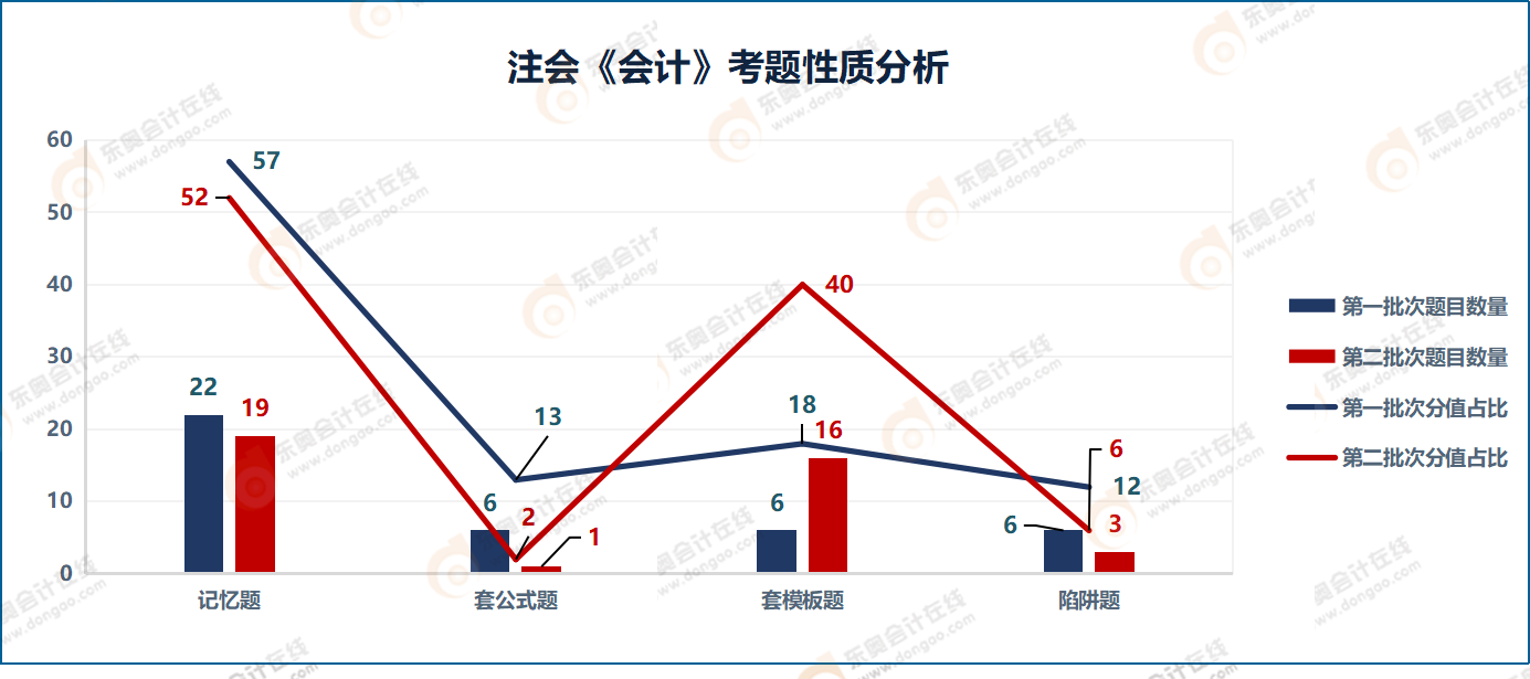 在第一批次考試中,記憶題所占的分值最多,為57分;套公式題、套模板題、陷阱題題量一致,分值比較接近;在第二套試卷中,以記憶題和套模板題為主,記憶題分值為52分,套模板題為40分;此外還有少量的套公式題及陷阱題。