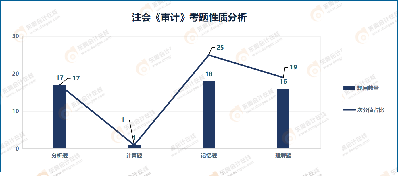 注會審計試卷中,分析題及記憶題、理解題考查的較多,分值也相對較大。在考生回憶的試題中,記憶題數(shù)量最多,為18道,分值為25分。