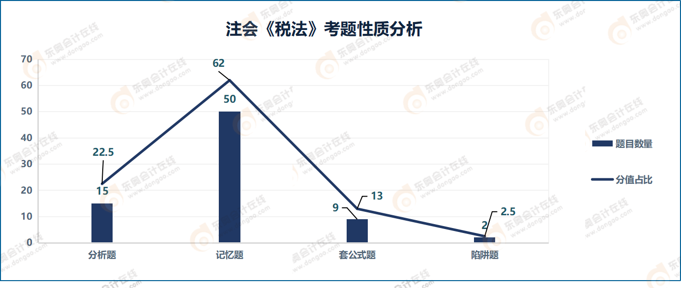 2021年稅法考試中,記憶題考查50道,分值為62分;分析題考查15道,分值為22.5分;套公式題考查9道,分值為13分;陷阱題考查2道,分值為2.5分。