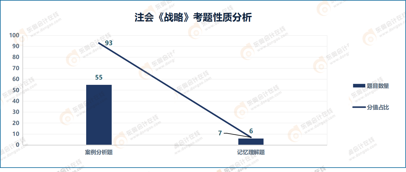 戰(zhàn)略考試中共計考查兩種題型,分別是案例分析題、記憶理解題。其中案例分析題占比最高,題目數(shù)量為55道,分值為93分。