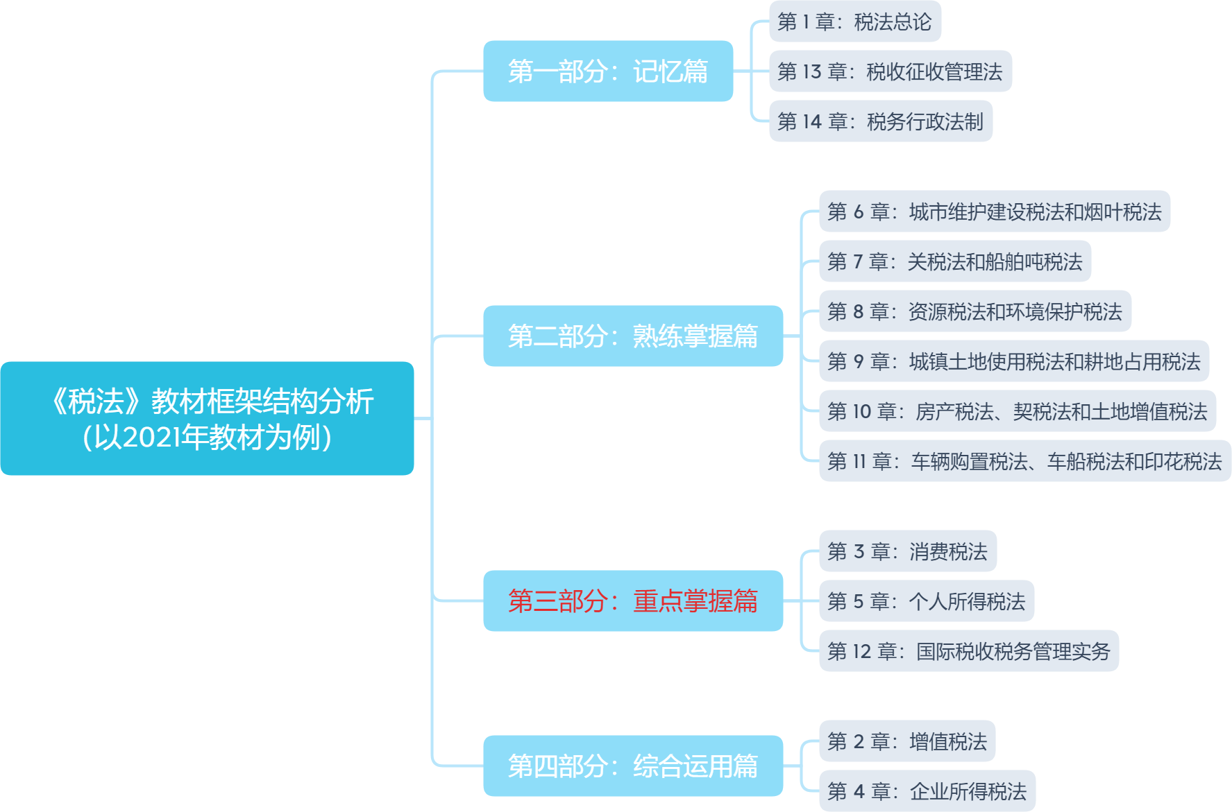 2022年CPA稅法官方教材尚未發(fā)布,以 2021年CPA稅法教材為例,教材主要分為四大部分,共計14章。以下是教材框架結構分析,考生需要分清主次章節(jié),合理安排學習計劃。