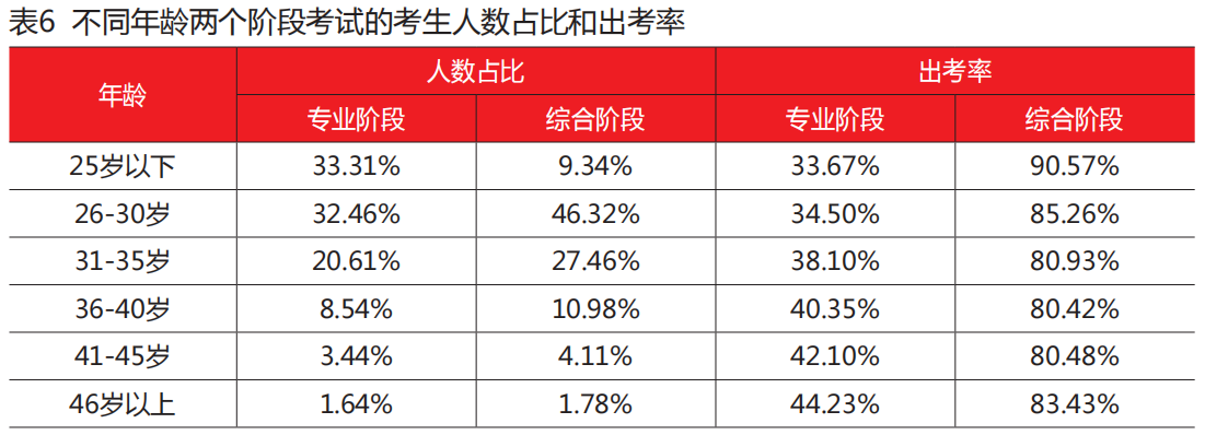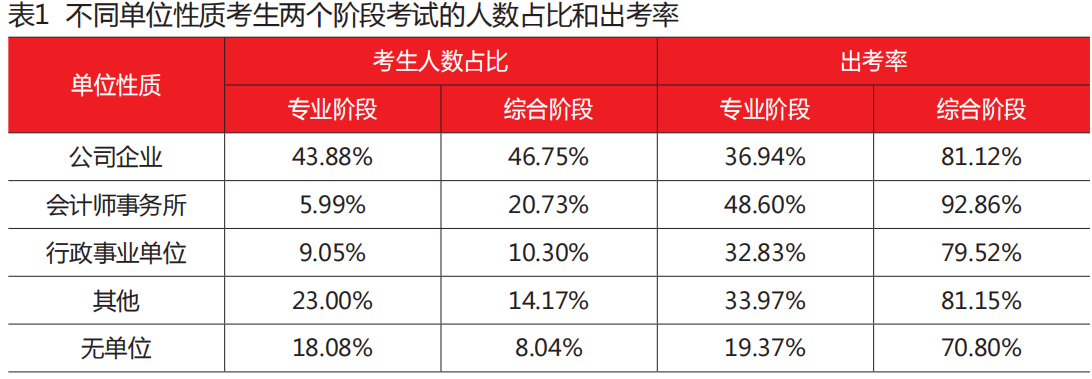 除此之外無單位考生的專業(yè)階段報名人數(shù)占比幾近20%,而專業(yè)階段考試報名人數(shù)占比卻不足10%,兩個階段考試的出考率也并不高,對于無單位考生而言,注冊會計師證書是尋求就業(yè)的機(jī)會之一。
