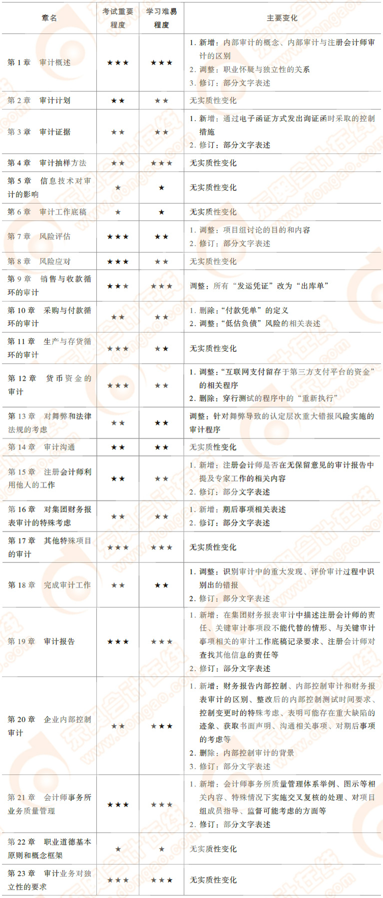 通過以上對cpa審計題型題量及各章節(jié)分值占比的分析,相信小伙伴們對審計科目已經(jīng)有了一定程度上的了解。趁熱打鐵!東奧小編又為大家整理了cpa審計教材各章節(jié)考試重要程度、備考難度及主要變化一覽表,希望對正在備考cpa審計的考生們有所幫助。