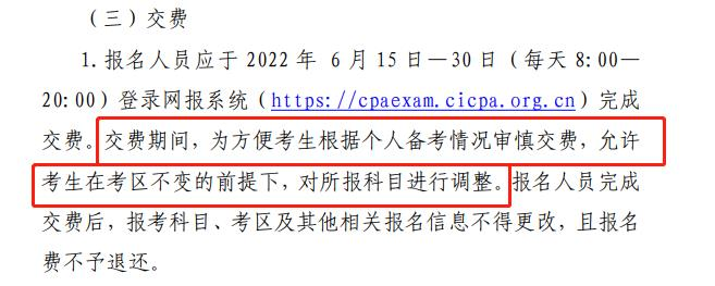 另外,2022年有一個(gè)非常利好的消息,注會(huì)考生可以在繳費(fèi)時(shí)視自己的復(fù)習(xí)情況,調(diào)整報(bào)考的科目。也就是說(shuō),只繳費(fèi)自己有把握的科目,也是可以的。