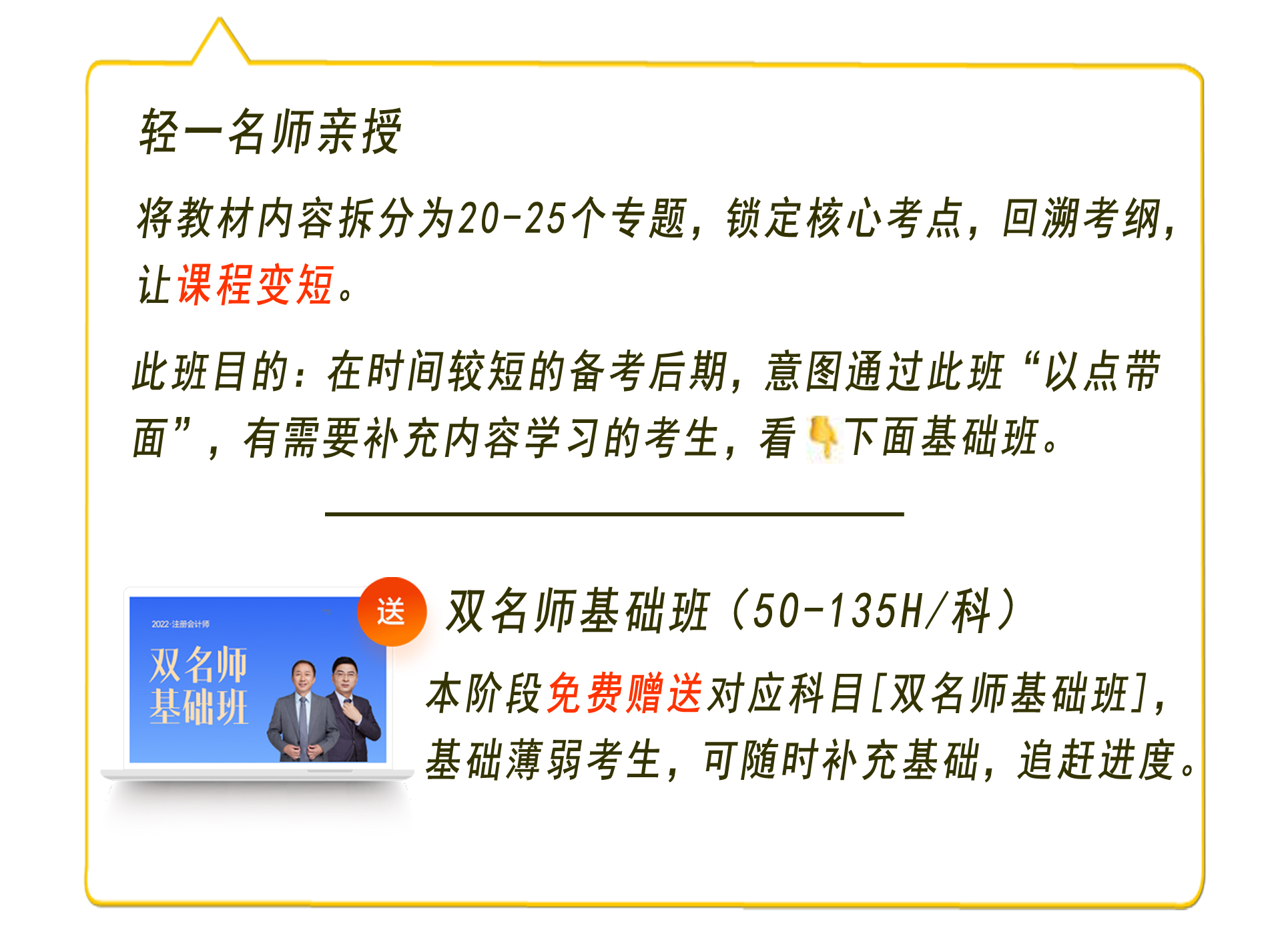 如果給你25天,你可以做什么?從頭到尾通篇復(fù)習(xí)顯然是行不通的,只復(fù)習(xí)重點(diǎn)章節(jié),又怕遇到知識(shí)點(diǎn)關(guān)聯(lián)問(wèn)題。怎么辦?25天東奧給你一套行之有效的備考辦法。2022年?yáng)|奧的注會(huì)VIP小班集訓(xùn)里,將全書(shū)知識(shí)點(diǎn)打碎重建,形成20-25個(gè)核心考點(diǎn)專題,將注會(huì)長(zhǎng)長(zhǎng)的備考之路“精煉濃縮”,讓課程變短,讓知識(shí)更濃。如果考生對(duì)于某個(gè)知識(shí)點(diǎn)掌握不佳,可學(xué)習(xí)該班次贈(zèng)送的“雙名師基礎(chǔ)班”相關(guān)內(nèi)容,“點(diǎn)面俱全”,隨時(shí)補(bǔ)救、追趕進(jìn)度。