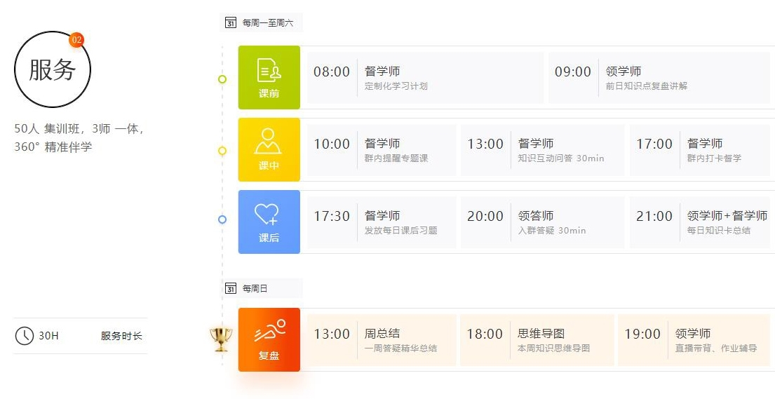 在班級(jí)群內(nèi),每周一至周六,“三師”都會(huì)在固定時(shí)間點(diǎn),提供貼心備考支持,提供定制化學(xué)習(xí)計(jì)劃、復(fù)盤前日知識(shí)、講授專屬課程、開(kāi)展問(wèn)答答疑。
