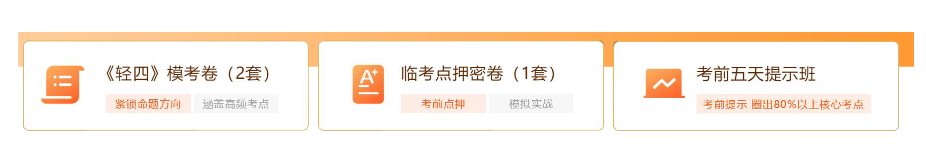 在此階段,考生將在10天中,通過(guò)《輕四》??季?、監(jiān)考點(diǎn)押密卷、考前五天提示班,接受考前最后階段的沖刺集訓(xùn)。全真模擬卷,覆蓋高頻考點(diǎn) ,鎖定命題方向,考練結(jié)合,全速?zèng)_刺,幫考生調(diào)整進(jìn)入應(yīng)試狀態(tài)。