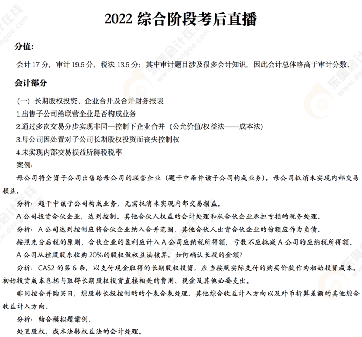 2022年注冊(cè)會(huì)計(jì)師綜合階段的考試已經(jīng)結(jié)束了,距離拿證只差臨門一腳!注會(huì)成績(jī)預(yù)計(jì)于11月下旬下發(fā),在此之前考生們想要對(duì)考題考點(diǎn)有所了解??忌鷤?cè)跂|奧考后直播中反饋了考試中遇到的知識(shí)點(diǎn),東奧會(huì)計(jì)在線為大家整理出了文字版本,方便大家閱讀觀看!點(diǎn)擊觀看完整直播>>>