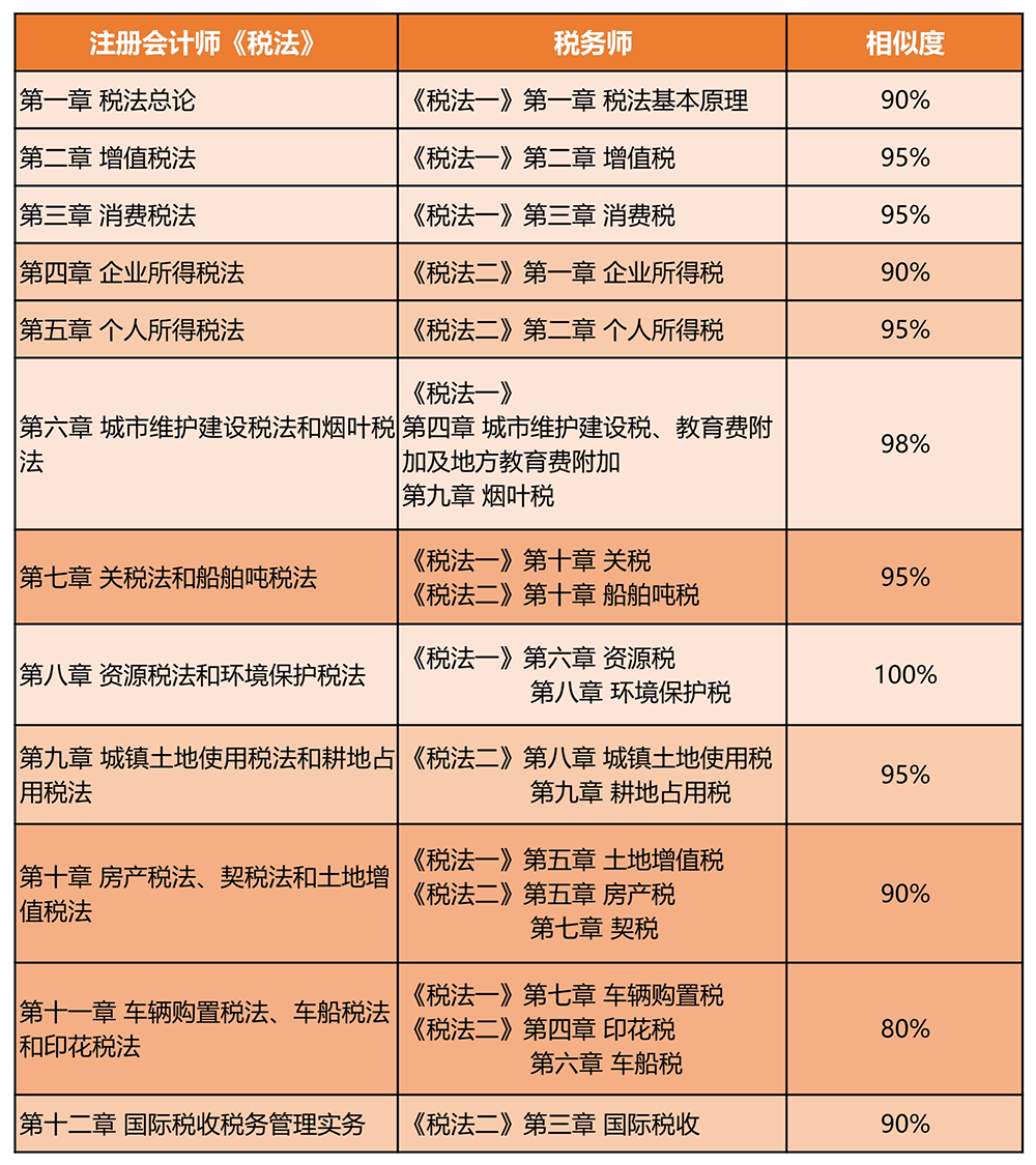 以CPA《稅法》和稅務(wù)師《稅法一》《稅法二》為例,其關(guān)聯(lián)度在80%以上,尤其是CPA《稅法》“資源稅法和環(huán)境保護(hù)稅法”與《稅法一》“資源稅”、“環(huán)境保護(hù)稅”,內(nèi)容相似度更是高達(dá)100%。