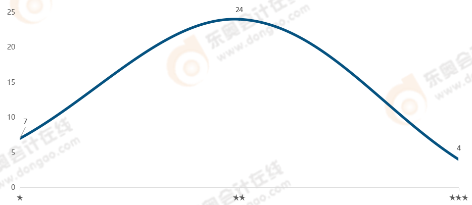 在注會審計科目的考試中,客觀題共計35道,分值占總分值的50%。根據(jù)考生回憶版試題對本次考試客觀題難易程度進行分析,詳情如下:本次考試二星難度試題占比最大,共有24道。一星難度和三星難度試題數(shù)量差別不大,其中一星難度試題數(shù)量較多,為7道,三星難度試題僅有4道。