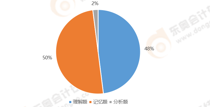 本次審計科目客觀題主要分為理解題、記憶題、分析題三大類。其中記憶題的分值占比最大,達到客觀題總分值的一半。理解題分值占比次之,但與記憶題相比分值占比差別不大,達到48%。分析題分值占比最小,僅為2%。