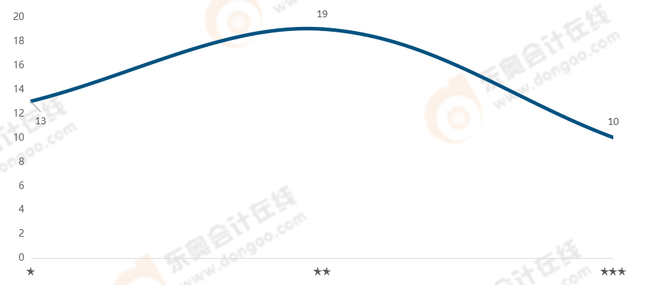 注會戰(zhàn)略科目考試客觀題共有42道,其中單選題共有26道,多選題共有16道。在本次考試的42道客觀題中,二星難度考題占比最大,共有19道。一星難度考題與三星難度考題占比相對較少,分別為13道和10道,戰(zhàn)略客觀題三個星級難度的考題數量相差不大。