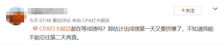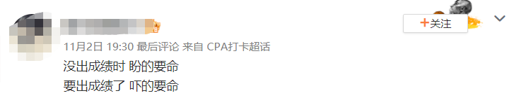 中注協(xié)在注會(huì)報(bào)名簡(jiǎn)章中沒(méi)有明確規(guī)定出分具體日期,只表明將于2022年11月下旬公布成績(jī)。不僅考生們時(shí)刻關(guān)注,就連小編也會(huì)每天登錄網(wǎng)報(bào)系統(tǒng)和微博超話查看注會(huì)查分新動(dòng)態(tài)。注會(huì)成績(jī)代表著考生們一年來(lái)的奮斗成果,大家等出分的焦急心情溢于言表……