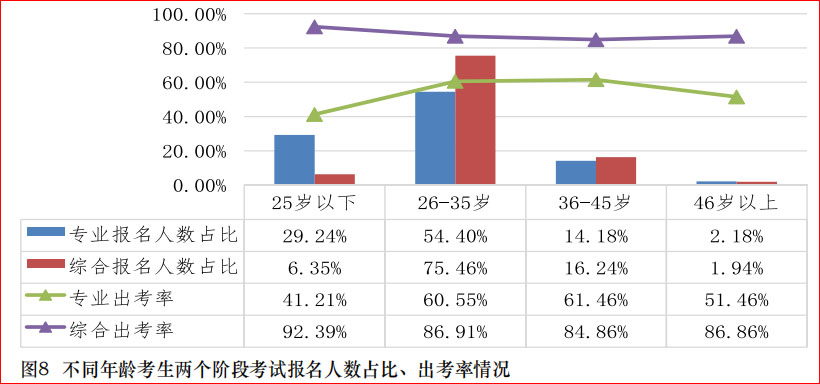 根據(jù)以上數(shù)據(jù)可以看出,這個(gè)年齡段的考生報(bào)名占比較高,出考率也很高。這部分考生一方面是沒有時(shí)間,缺少精力,還要面對(duì)生活和工作帶來的壓力,一方面還要考慮未來的生活,職業(yè)的規(guī)劃,往往陷入迷茫。