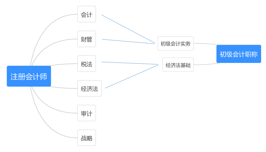 如下圖,注會(huì)專業(yè)階段考試中,會(huì)計(jì)和財(cái)管科目與初級(jí)會(huì)計(jì)職稱考試的初級(jí)會(huì)計(jì)實(shí)務(wù)有較高的契合度。而稅法和經(jīng)濟(jì)法則與初級(jí)會(huì)計(jì)職稱的經(jīng)濟(jì)法基礎(chǔ)相契合。