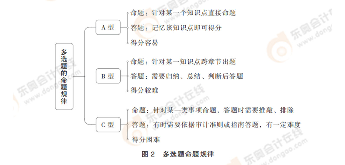 簡答題“聚焦”十一個知識模塊,綜合題重點是業(yè)務循環(huán)審計的風險識別、評估與應對,單選、多選題可分為A、B、C型,規(guī)律總結詳情如下: