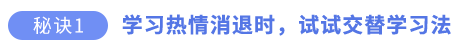 所謂交替學(xué)習(xí)法是指在復(fù)習(xí)過程中,將搭配的2~3門科目進(jìn)行交替性學(xué)習(xí)。采用這種方法學(xué)習(xí)會(huì)減少我們的厭煩,保持持續(xù)的學(xué)習(xí)熱情。