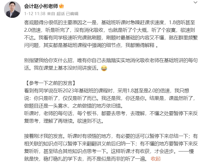 趙小彬老師為大家分析了客觀題得分低的原因,其中之一是在基礎階段學習時,有些考生可能由于急躁、追趕進度等因素,選擇1.8倍速甚至是2倍速聽課。正所謂欲速則不達,囫圇聽完基礎階段課程,不僅沒能消化吸收基礎知識點,還可能錯過強調(diào)的細節(jié)點,其負面影響在強化階段練習時就會顯現(xiàn),這部分考生經(jīng)常會被較為基礎的習題搞得一頭霧水。所以怎樣學習才是正確的?