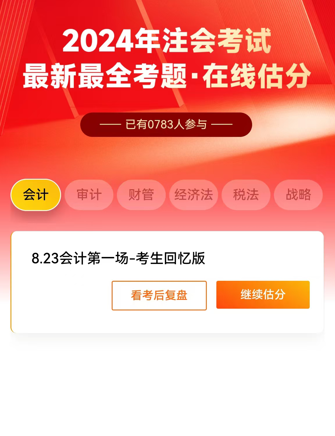 估分試題、參考答案及解析由東奧教研團隊根據(jù)考生回憶整理并解答提供,考生可根據(jù)回憶選擇每道題答案,完成后系統(tǒng)會根據(jù)考生選擇結(jié)果進行估分,成績僅供參考,最終成績請考生以官方結(jié)果為準!此外東奧還開展了有獎征題活動,點擊參與活動,贏獲獎機會>>2024年注會考試成績下發(fā)時間預計為11月下旬,預祝各位考生都能取得理想的成績!
